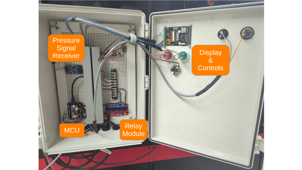 While there are purpose-built industrial pumps for moving materials that vary in thickness from “like honey” to “literally clay”, they have quite a premium price tag. Commodity-grade grease pumps, on the other hand, are capable pushing thick materials while handling pressures upwards of 5000 psi at a much more reasonable price point. They don’t tend to have any sort of controls apart from an air pressure input to cycle the pump, so I came up with my own using an ESP32-based microcontroller and some solenoid valves. The microcontroller keeps an eye on the pressures at the pump and at the extruder, and turns the pump on and off as needed to keep both within a range that keeps the printer going without running out of material. It’s incredible how much code it takes to essentially flip a light switch on and off: I’m at about 800 lines of code (not counting imported libraries). Most of the code is for drawing a user interface on the screen of the control box, with a majority of the rest telling the microcontroller how to read and record pressure data to a microSD card.