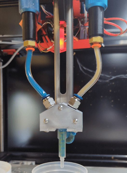 After some initial experimentation, I found out that our print material is so thick that the lab’s 100 psi air pressure wasn’t enough to push material back out of an accumulator after it filled up. This was frustrating at first, but the solution ended up being wonderfully simple: remove the accumulator entirely. I came upon some reinforced flexible tubing that hit a balance between strength and stretchiness that allowed it to handle our pump pressure while at the same time smoothing out material flow, reducing both complexity and cost from the design.