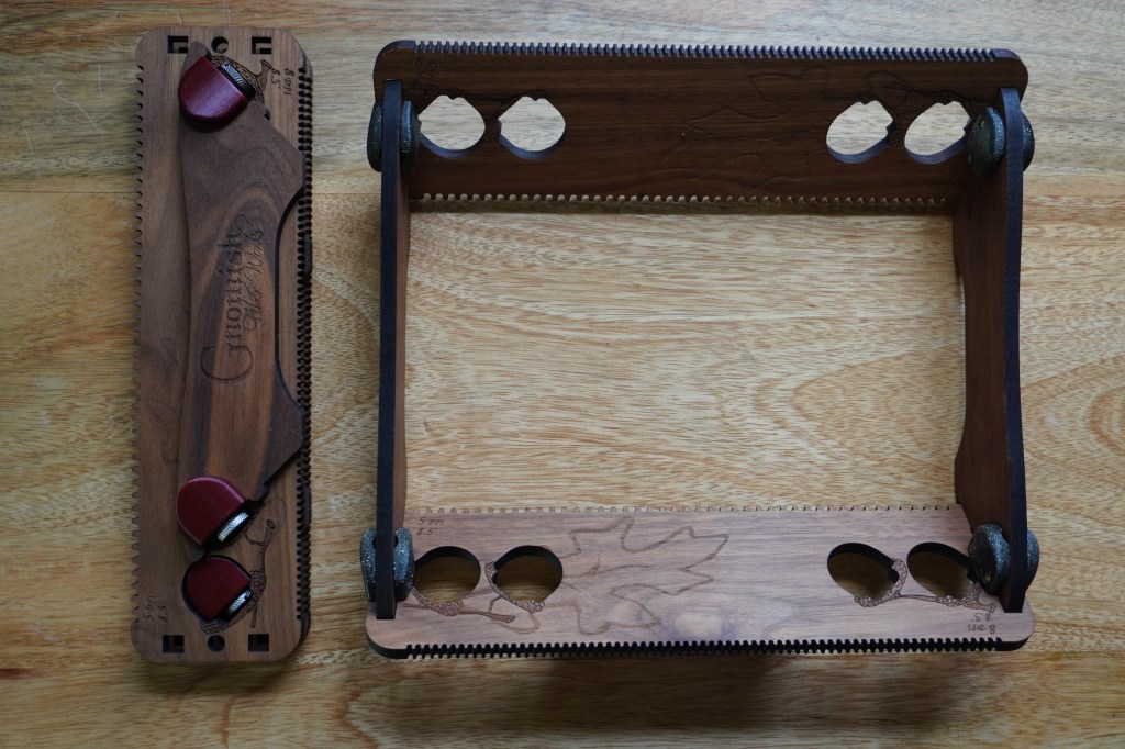 My wife runs a business selling hand-dyed yarn and yarn-related accessories and tools, and every once in a while I do some design work/product development for her. One type of product we’ve been working on is a small weaving loom that can be disassembled and stored in a compact form factor. Originally, we made these out of laser-cut wood boards with 3D-printed connectors.